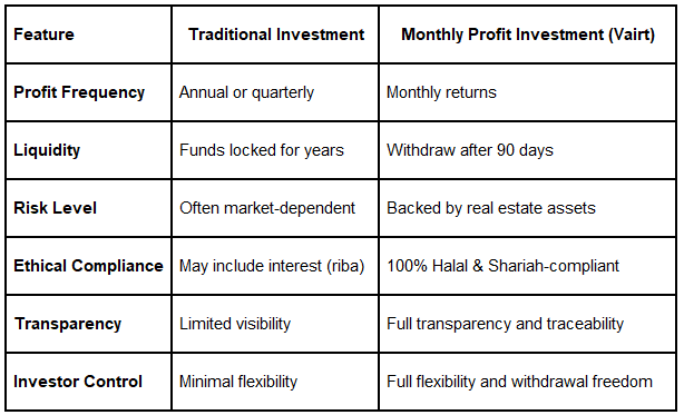 Vairt stands out with decades of real estate expertise, ethical investment structures, and a unique monthly profit model that truly aligns with Islamic values.